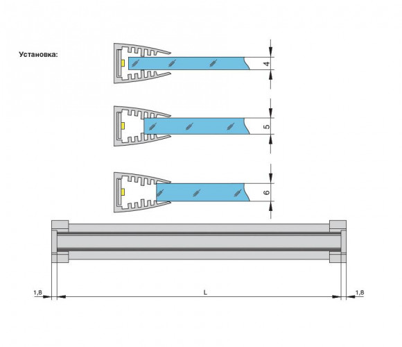 Профиль устанавливается на заднюю сторону стеклянных полок толщиной 4 - 6 мм.