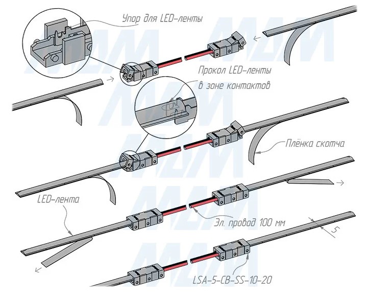 Применение: коннектор позволяет соединять два отрезка светодиодной ленты SMD или COB шириной 5 мм
