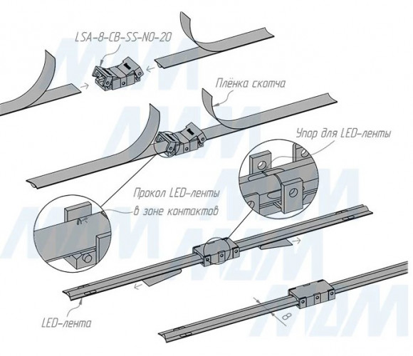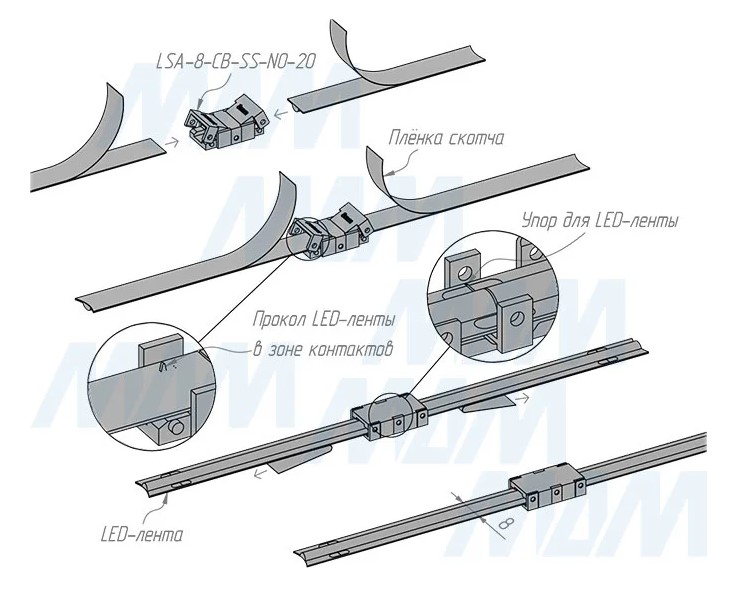 Применение: коннектор позволяет соединять два отрезка светодиодной ленты SMD или COB шириной 8 мм