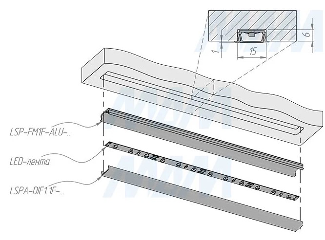 • имеет плоскую поверхность, что позволяет не делать фрезеровку полки в месте стыка при вертикальном монтаже подсветки на корпусе;