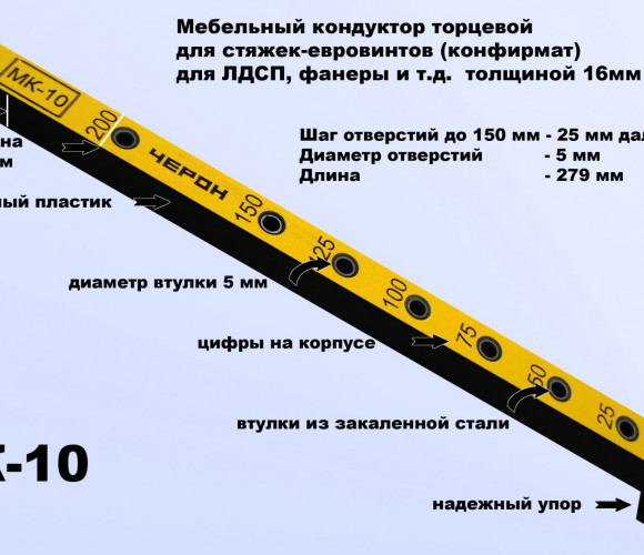 - Сверление под стяжку "евровинт" производится двумя кондукторами на 5 мм в торец и на 7 мм в плоскость. Соответственно в пару к МК-10 нужно использовать угольник МК-16.
