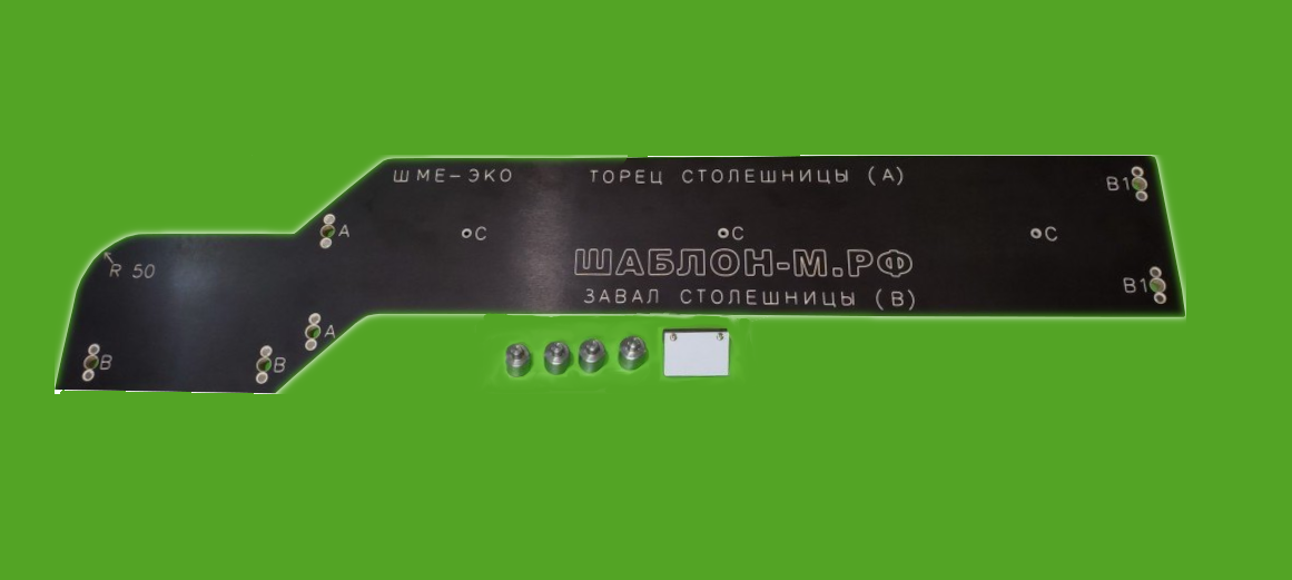 ШМЕ-ЭКО это шаблон для еврозапила изготовленный из влагостойкой ламинированной 12-миллиметровой фанеры. ШМЕ-ЭКО имеет все функции ШМЕ1 . Установочные гнёзда (А, В, В1) с мощными магнитами для фиксирования стопоров, которые помогают правильно расположить шаблон для фрезерования столешниц. Через отверстия С с установленными калёнными втулками под сверло 3 мм для разметки посадочных отверстий Ø 35 мм. В посадочные отверстия устанавливаются стяжки которыми производят плотное соединение столешниц.