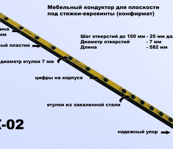 - Мебельный кондуктор кондуктор МК-02 предназначен для сверления отверстий 7 мм в торце плиты 16 мм с шагом отверстий 25/50 мм. (можно сверлить плиты и другой толщины с использованием переходников)