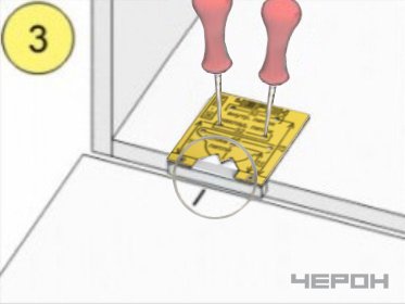 • Установите шаблон на фасад изделия таким образом, чтобы носик шаблона совпал с намеченной отметкой.