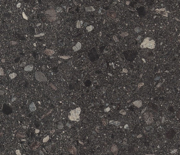 В соответствии с тенденцией к использованию имитаций терраццо была создана выразительная репродукция камня Камень Вентура чёрный. Модными являются комбинации с чёрными однотонными или древесными декорами. Со светлыми классическими древесными репродукциями декор столешниц создаёт современный контраст. Благодаря разноцветным камням в рисунке декора он особенно хорошо гармонирует также с пастельными цветами разных оттенков. Структура ST76 Минерал шероховатый матовый придаёт декору рельефность, на ощупь напоминающую шероховатую поверхность камня.