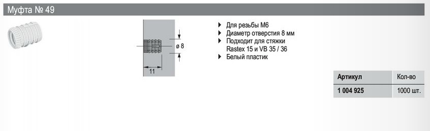 100492500 Муфта пластиковая №49, М6х11мм, диаметр 8мм