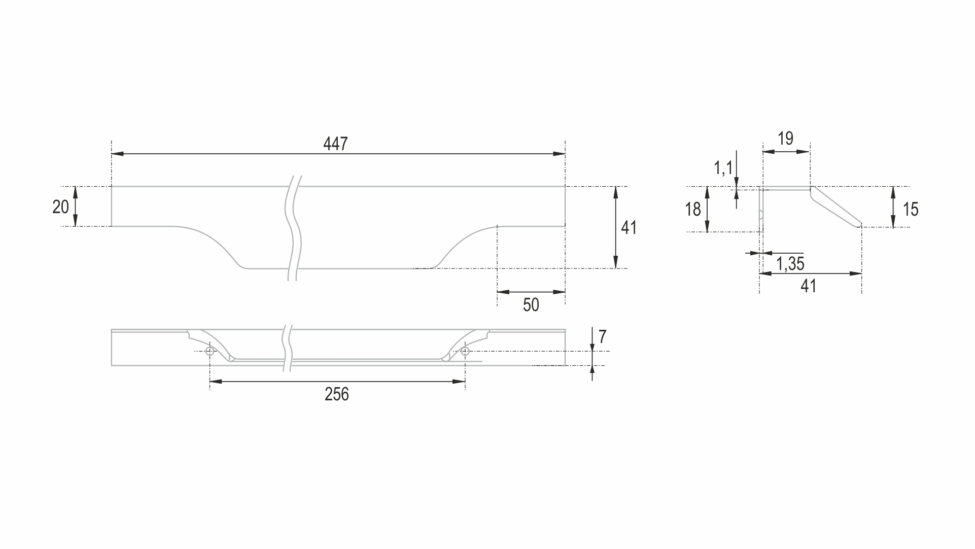 WING RT114 допускает размещение двумя способами — «в размер» фасада (актуально для размеров 500-900 мм) и по центру широких фасадов, как большой «язычок» (для размеров 150 мм, 200-400 мм, 450 мм).
